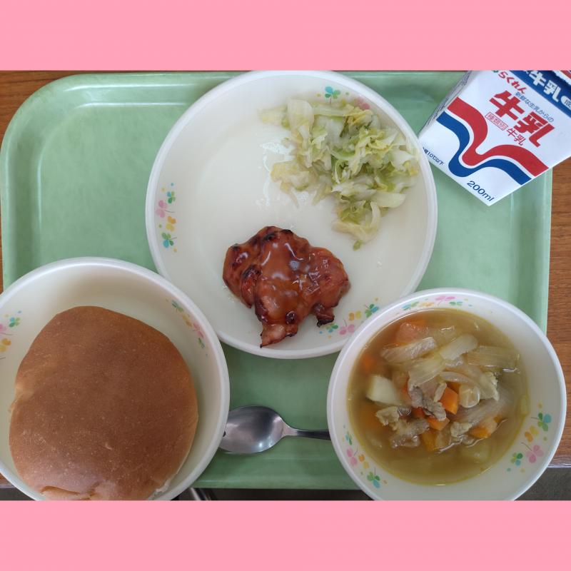 5月11日(火)の献立 2021年5月11日 12時30分 食育 今日の献立は、「バーガーパン、牛乳、鶏の照り焼き、キャベツソテー、カレービーンズスープ」でした。バーガーパンに、照り焼きとキャベツをはさんで、「照り焼きバーガー」の完成です。大好きな人も多かったのではないでしょうか?