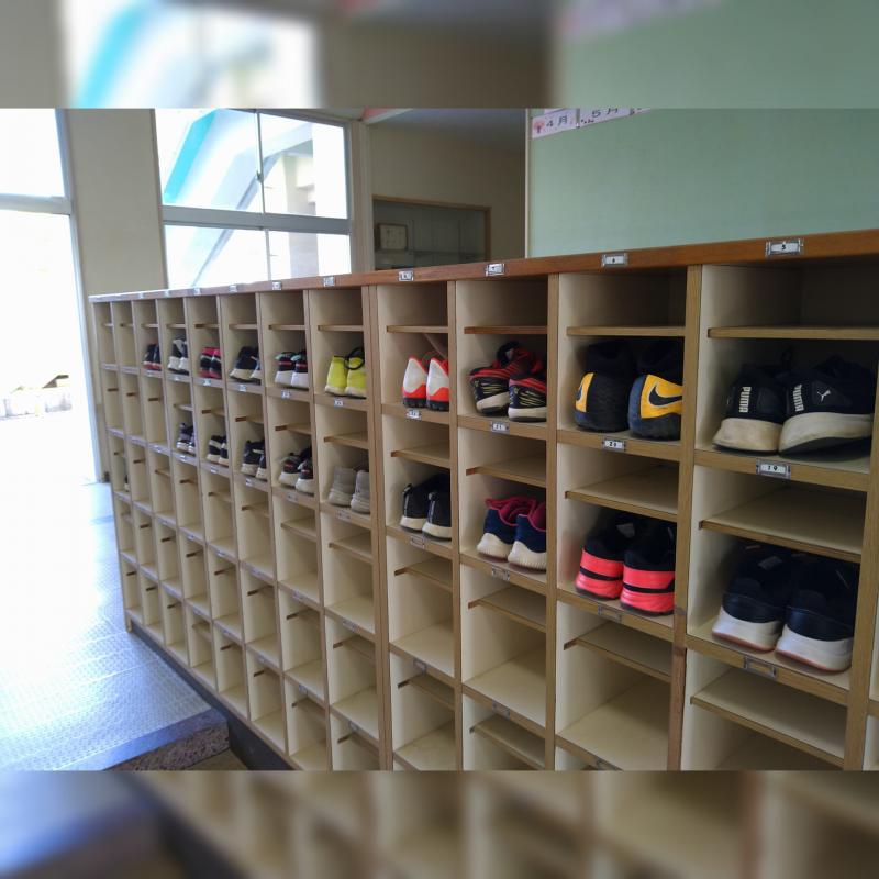 今朝の児童玄関、4年生の靴箱です。整った靴が、気持ちよく並んでいます。