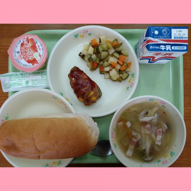 5月13日(木)の献立 2021年5月13日 12時40分 食育 今日の献立は、「コッペパン、牛乳、ピーマンの肉詰め、さいころサラダ、ファイバースープ、りんごゼリー」でした。今日も野菜をたくさんとることができました。ごちそうさまでした。