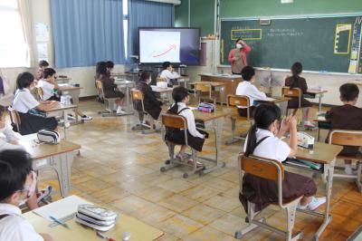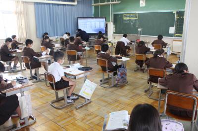 1年生の様子です。 電子黒板を活用しながら授業しています。